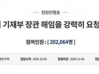 홍남기 경제부총리 겸 기획재정부 장관의 해임을 요구하는 청와대 국민청원에 참여한 인원이 27일 20만명을 넘었다. 주식 양도소득세를 부과하는 대주주의 기준을 10억원에서 3억원으로…
