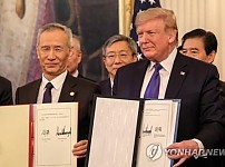 ▲ 1단계 무역합의문 손에 든 트럼프 대통령(오른쪽)과 류허 부총리 미국과 중국 간 갈등이 끝없이 격해지는 가운데 중국이 미국의 압박이 계속되면 1단계 무역 합의를 파기해버릴 수 …