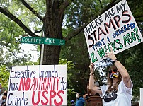 ▲ 미국 연방우체국장 집 앞에서 '배송 지연' 항의하는 시위대 미국에서 오는 11월 대선을 앞두고 우편 투표가 정치 쟁점으로 떠오르자 일부 주가 이를 대체할 다른 투표 방식에 주목…