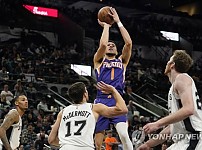 ▲슛하는 피닉스의 데빈 부커(가운데).미국프로농구(NBA) 피닉스 선스가 샌안토니오 스퍼스를 꺾고 4연승과 함께 선두를 질주했다. 피닉스는 18일(한국시간) 미국 텍사스주 샌안토니…